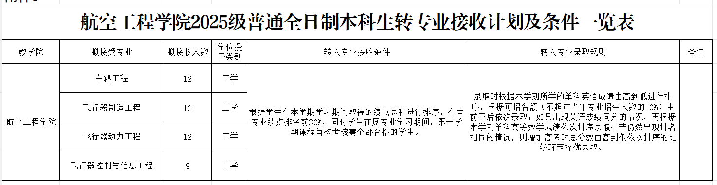 航空工程学院2025级普通全日制本科生转专业接收计划及条件一览表